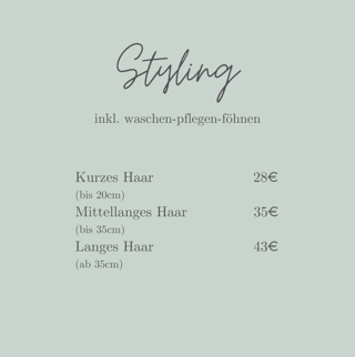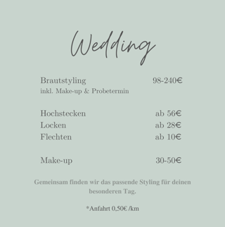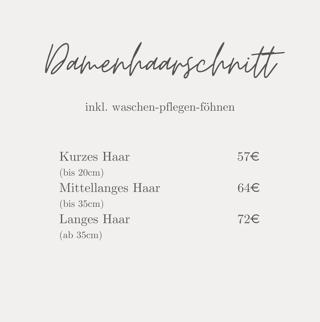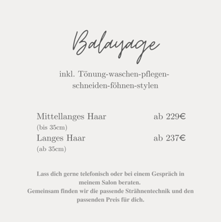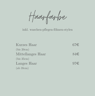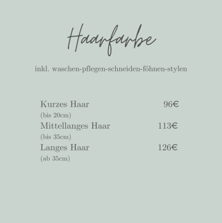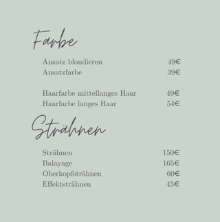 Hier ist für jeden etwas dabei. Von verschieden Farb- und Strähnentechniken, einem neuen Schnitt oder einer einzigartigen Hochsteckfrisur für Ihren ganz besonderen Tag. Ich stehe Ihnen auch für Fragen oder einer individuellen Beratung gerne zur Verfügung.
