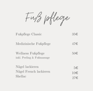 Fußbad, Peeling, Hornhaut entfernen, Nägel kürzen und formen, Fußmassage, Abschlusspflege